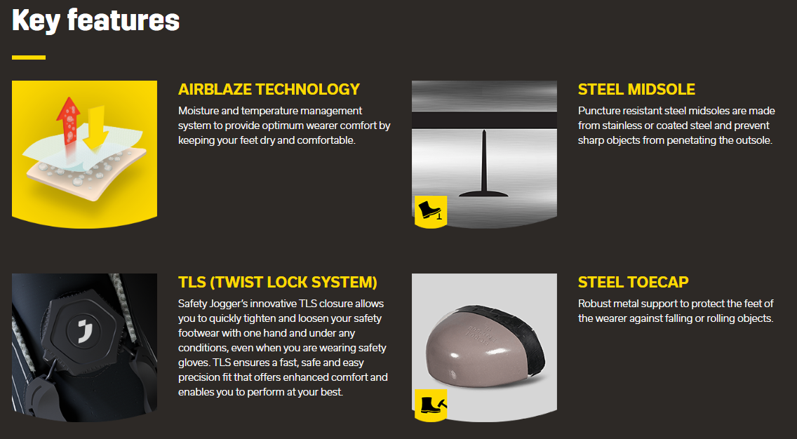 This mid-cut S3 safety shoe is equipped with the next technical closing system: the Safety Jogger twist lock system (TLS).