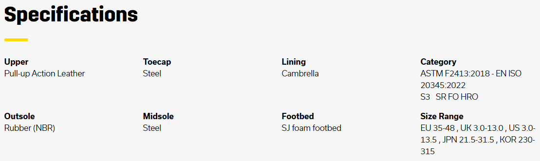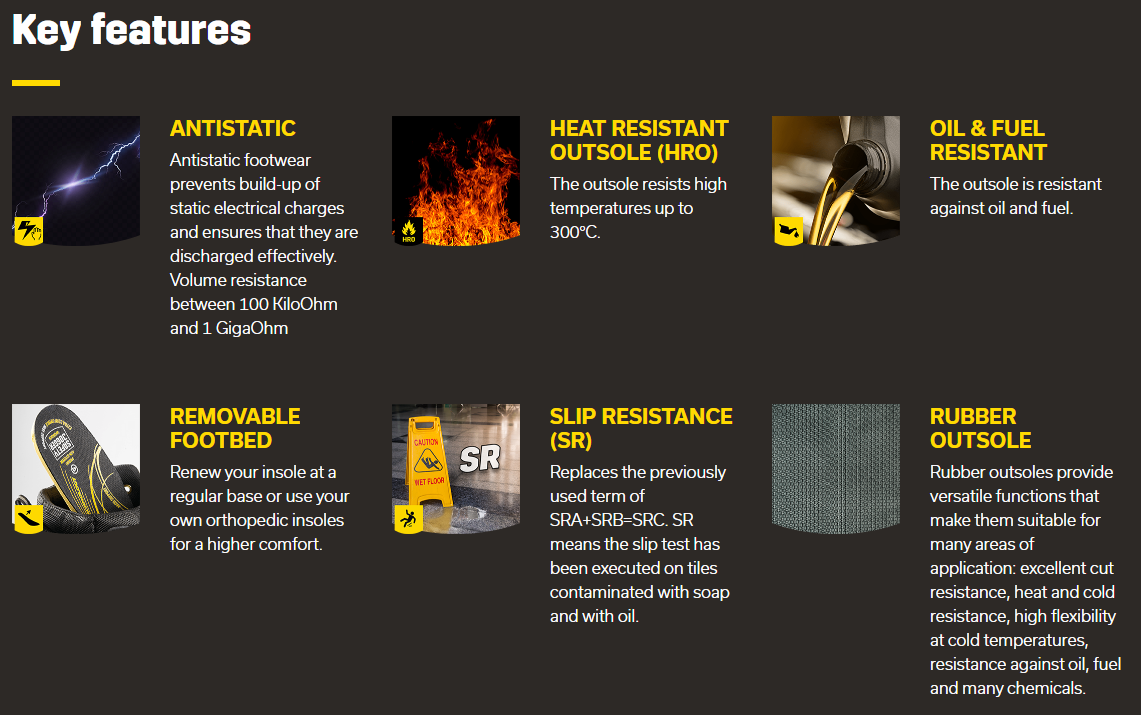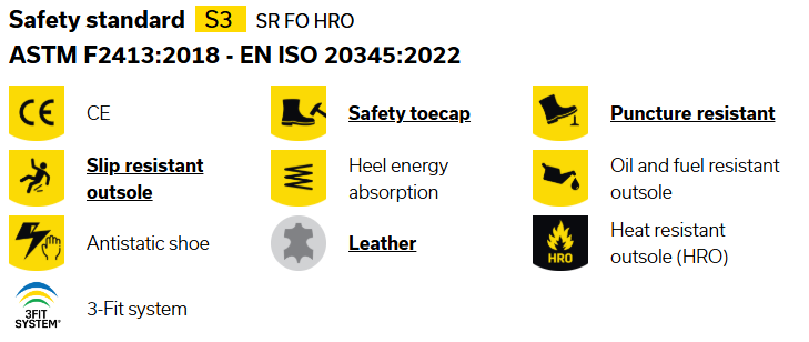 It has a heat-resistant outsole that withstands temperatures up to 300°C, and is also resistant to oil and fuel.