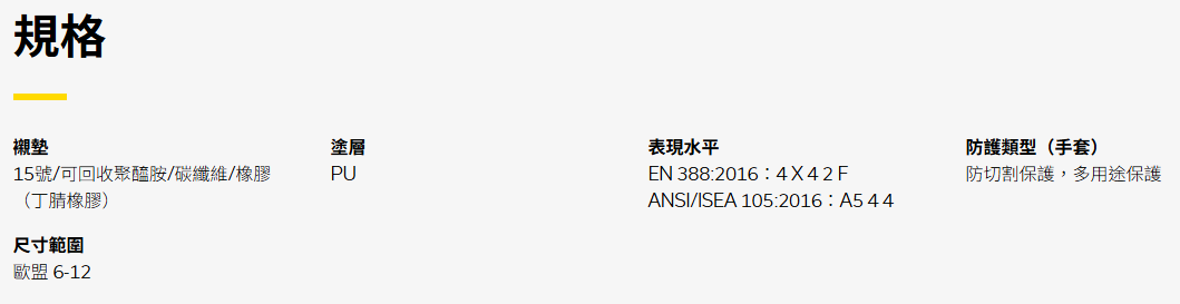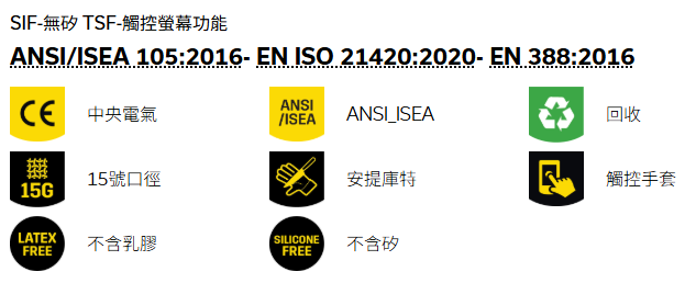 表現水平: EN 388:2016:4 X 4 2 F ANSI/ISEA 105:2016:A5 4 4